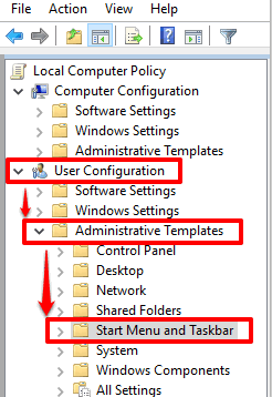 - Now this time, double-click Administrative Templates folder. When you have done this, you will see “Start Menu and Taskbar” folder. Click on that folder.
