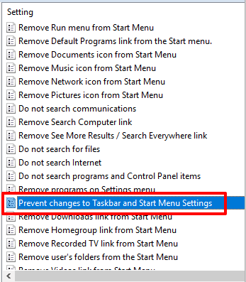 Step 3: At the right pane, you will see some options. Carefully scroll the list of options, find “Prevent changes to Taskbar and Start Menu Settings” option, and double-click on it.