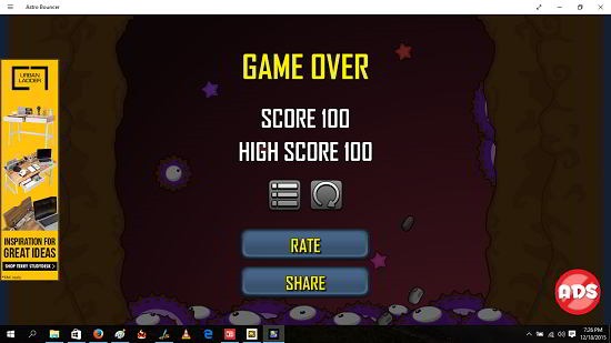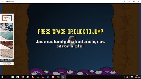 Astro Bouncer is a free endless game app for Windows 10 devices. The game supports touch and keyboard input, both. In the main menu you can choose the game type. The game is based on the principle of keeping the astronaut alive while collecting all the stars and power ups. The objective is to create a high score. If the astronaut falls on the spiked monsters at the bottom of the screen it’s game over. To keep him afloat, you have to use the spacebar and press it according to the position of the astronaut on the gameplay screen.