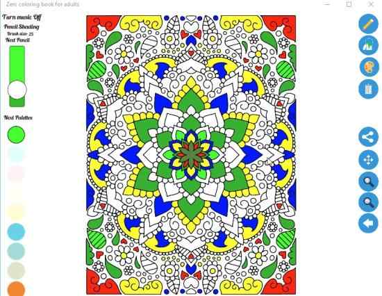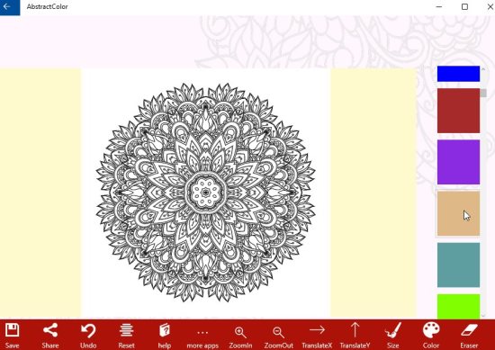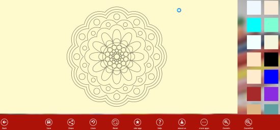 Adult coloring book has some good images which can be colored. But most of the mandala design are locked and can only be used when upgraded to the paid version. The coloring pages are quite nice, there are images of animals, different scenery, and one mandala design in the free version. Any design you choose will open up in full screen with option on right side and bottom of the window. This can be seen in the screenshot above. On the right side you can see the color palette from where you can choose color. The bottom bar has the regular option to undo, reset, zoom in, zoom out, about us, help, etc. The save option lets you save your colored image on your computer in JPEG format. The share option is used to share your creative work with your friends.