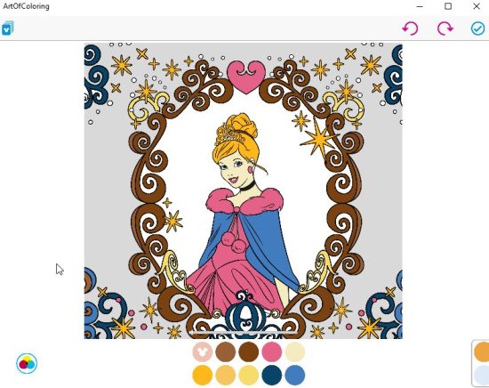 Art of coloring by Disney is a lovely app which can be used by kids as well as adults. The free version of this app gives you 8 free designs which can be used over and over again to color. If you do like the app and want to upgrade then you will get a huge database of designs to color. Go to the free section from the top of the page and all the 8 designs can be seen. Now select any one which you want to start with. It will open up in full screen. The bottom of the screen will show you a very limited color palette with this version. The top right corner has the undo and redo buttons, along with them a check mark icon will let you save and share your creative work. The file saved to your device will be in JPG format.