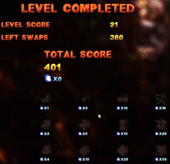 The level up screen looks like the screenshot above. It shows your total score and number of swaps you have made. The graphics of the app are nice and give you a real alien type feeling.