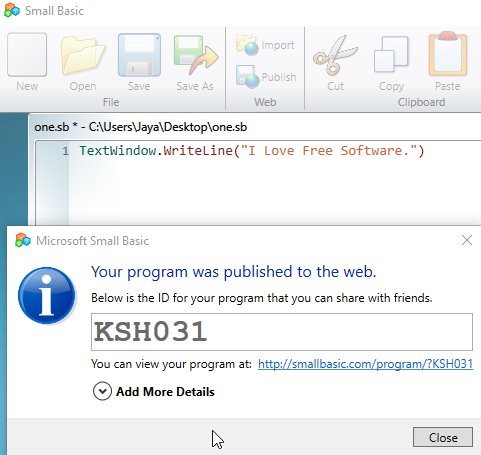 Import a code file that you already have on your computer. Publish the program that you just created. This program will be published on the web and you will be given an ID which you can use to share this program with your friends. This can be seen in the screenshot below.