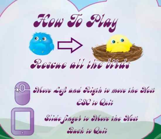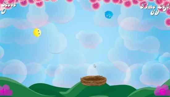 The nest can be seen at the bottom of the screen, which can be moved around to catch the falling birds. Different colored birds would start falling from the top or sides as soon as you start the game. So you have to be ready to move around the nest to catch them. If the birds hit the edges of the next then they bounce.