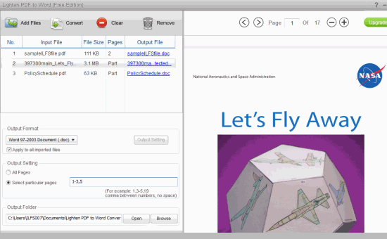 Lighten PDF to Word (Free Edition) is a very handy software to bulk convert PDF files to word files. Apart from converting PDF to doc and docx format, it can also convert it to plain text format. Most unique feature of this software is that it lets you set separate page range for separate PDF files. For example, you can set 1-5, 7 page range for one PDF file, and can set 1-10 or any other page range (depending on number of pages) for another PDF file.