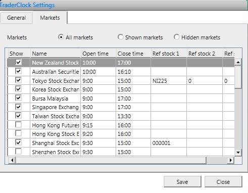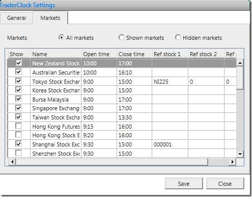 - Markets: This setting displays a list of popular global financial markets like New Zealand Stock Market, Australian Securities Exchange, Tokyo Stock Exchange, Singapore Exchange, National Stock Exchange of India, Bombay Stock Exchange, Swiss Exchange, London Stock Exchange, New York Stock Exchange, Mexican Stock Exchange, etc. You can choose up to 9 markets form this list to be displayed on the clock’s interface. To choose a market, just double-click on the checkbox against the market entry in the list.