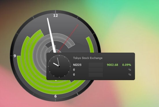Trader Clock is extremely simple to use and manage. Even a neophyte can use it with great ease. The interface of this free stock market software looks like an analog clock which constantly ticks the current system time. In the inside region, it shows circular stripes covering the time period for which a stock market opens. You can choose up to 9 markets from the Settings section to be displayed on the clock’s interface. The market which is currently open is shown with a Green colored stripe. You can hover your mouse cursor on any stock market to know the current exchange value and percentage change in stock value of that stock market.