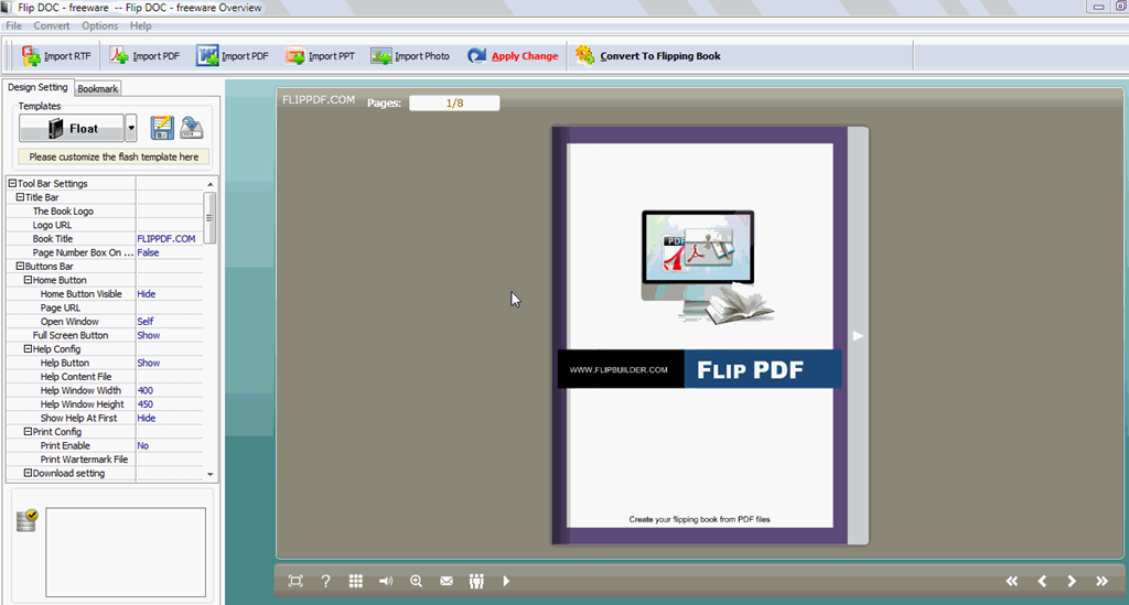 As, it can be seen from the above Flip DOC home screen that there’s an option to import your RTF file. You just need to import that file and click on Convert to flipping book, to convert your RTF file into a digital flipping book. The UI is so simple that every option can be seen very easily. The flipping book design settings are available at extremely left side of the application. Here, you can set the title bar, config bar, download configurations, help configurations, page height and width, sound, zoom configurations etc. The navigation buttons (at extreme right bottom corner) helps in easy navigation between the pages using your mouse.
