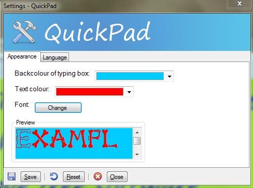 You can click on the “Options” menu and choose “QuickPad Settings” option to change QuickPad settings and personalize its user interface. Here you can change the text color, background color, and font color, and see a live preview of them. Once you are done, you can save the changes and start working on your editor with a brand new look.