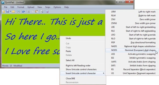 Apart from that, QuickPad provides options to insert unicode control characters in the text and encode the file in ANSI, Unicode, Unicode Big Endian, or UTF-Format before saving it as a text document.