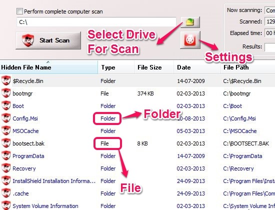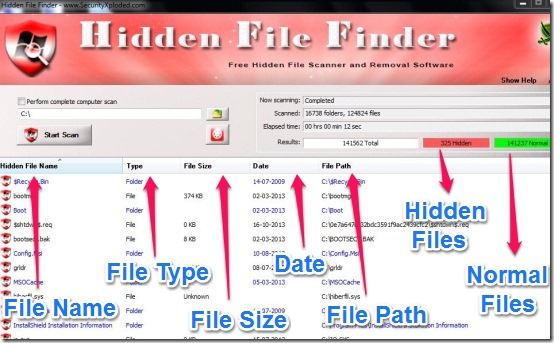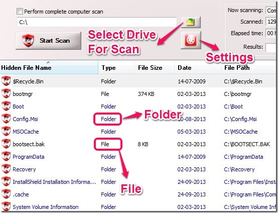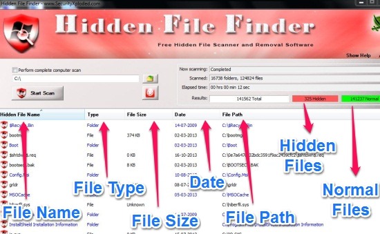 The Hidden File Finder can search for all the hidden files and folders in a particular drive or whole computer. What the Hidden File Finder does is that it scans the selected drive or complete computer, and after the scan is complete all the files that are hidden are displayed in the form of list on the screen. Then you can browse the files and folders from the list and view which files and folders are hidden from you. You can also further edit them. I have tested it in Windows 7 and here is an image below for the scan of C drive.