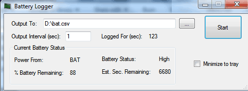 Step 3: Now click on Start button to start logging your battery information to the CSV file. It logs battery information after every number of seconds that you have specified in Step 2. In CSV file it stores date & time of each entry, power source, battery percentage, battery status, and estimated battery time remaining (in seconds).
