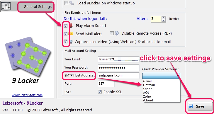 - Send Mail alert and capture user video (who tried to login). A webcam will be required if you want to capture intruder’s video. To activate mail alerts, you need to provide your email address, password of that email, SMTP host address, and port number. For users facility, there are some quick provider settings available that helps to set host address and port number automatically.