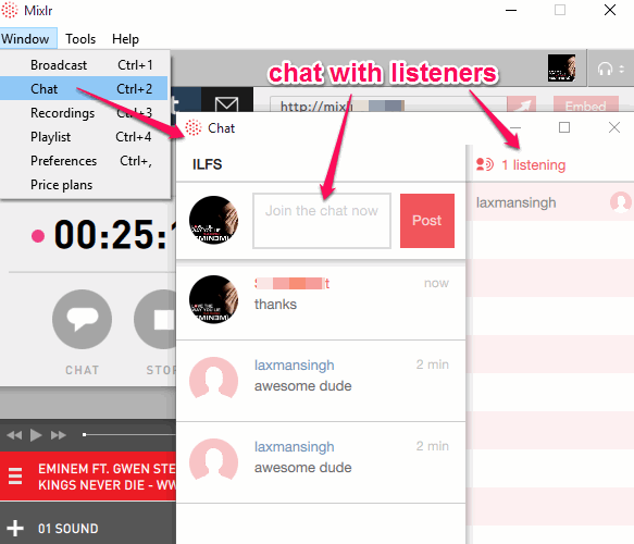 Anyone who will access the URL can listen to your broadcast. Moreover, people who will create free accounts on Mixlr can also chat with you. You can open the chat window to start the conversation with listeners.