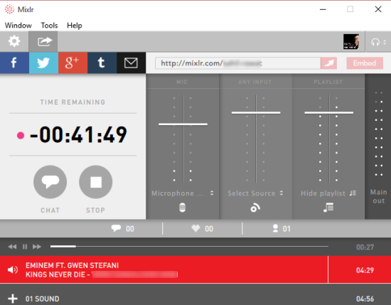 A link is generated for your audio broadcast which you can share with anyone. People don’t need to create any account or install this software to listen to the broadcast, but yes, to chat with you and to follow you on Mixlr, they must have a free account.