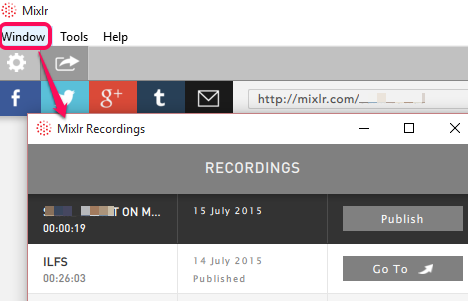 - Your recordings are saved separately in a list. You can use Window menu to access Recordings option. From the list, you can also publish any recording to Mixlr. Published recordings remain public and anyone can listen to it.
