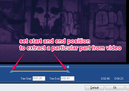 Trim Video option is very simple to use, but quite handy when you need to extract only a particular part from a particular video. Simply select start and end position and extract the selected portion.