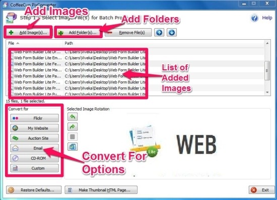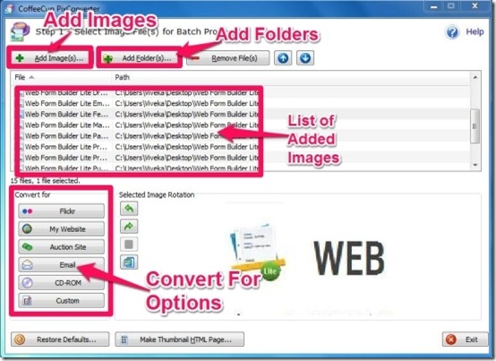 You can try other software to batch rotate images - Make Thumbnail HTML Page: This lets you create thumbnail collection of images (check the screenshot below) on a webpage. When you click on the thumbnail, it opens the image. You can use this HTML files to provide these images on your website. After adding image on CoffeeCup PixConverter, click on the “Make Thumbnail HTML Page” button. This will pop-up a new window where you can add the Title and comment for the page. You can also link this to your website’s homepage.