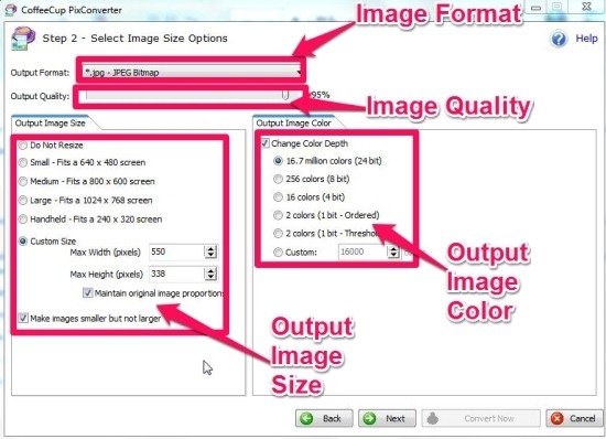 - Output Image Color can be used to change color depth. It provides various options like 16 colors, 256 colors, 2 colors, and even full color depth of 16.7 million colors (24 bit)