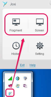 Just after joining with Joxi, it will run on system tray. To start capturing screenshots, just right-click on its tray icon, and use fragment button (to capture a specific region) or Screen button (for full desktop screen). Default hotkeys are also available for capturing the screenshots, which you can change later as well.