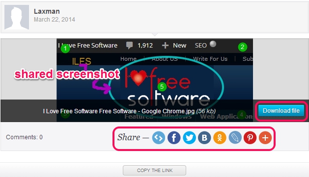A link for each captured screenshot is added to all accounts in which you have shared your screenshot. Clicking on that link will let your friends view, download, and share whatever you have uploaded. If your friends also have an account on Joxi, then they will be able to like and comment on your screenshots as well.