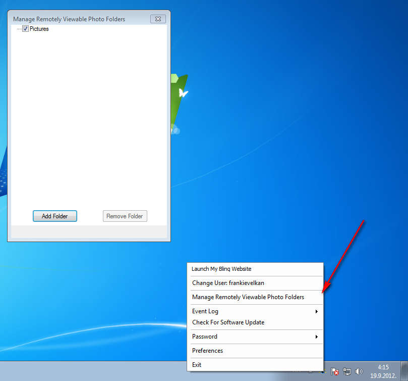 The application is gonna work in the system tray, to share folders and allow remote access to them, right click on the tray icon and select Manage Remotely Viewable Photo Folders. Window will pop up where you’ll be able to add image folders that you want to share online. Once that the folder is added, open up your BlinQ account and you should see new folders with images available there.