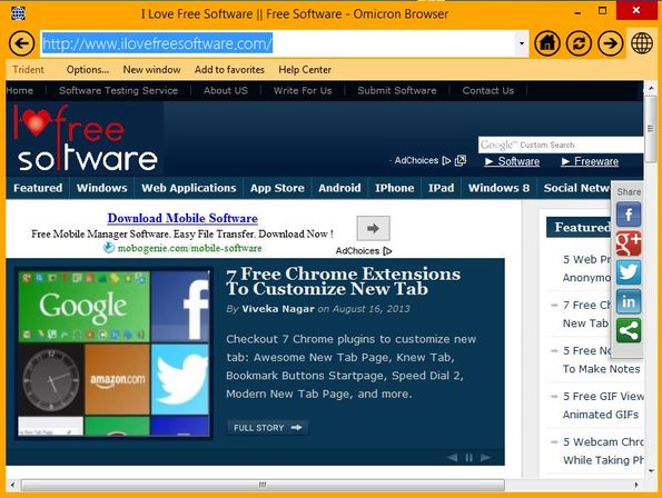 Omicron Browser is a free portable web browser which comes with dual website layout rendering engines, Trident and Webkit and it also has a modern, simplistic interface design very similar to that of Windows 8. For this reason Omicron is aimed more at Windows 8 users where it can be used as an Internet Explorer alternative, if you are not quite satisfied how the latest version of Internet Explorer and it’s full screen interface type of approach.