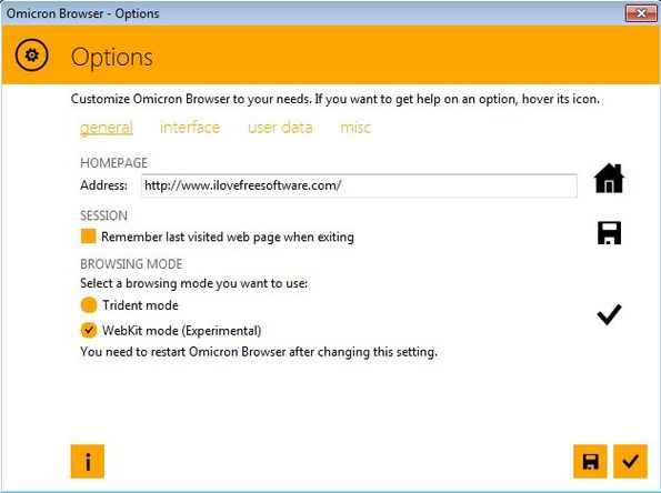 When running Omicron Browser for the first time, you’ll see an introductory setup wizard where you’ll be asked to set the homepage. Once the actual browser opens up, you can access additional settings where color of the interface can be changed and where you can switch between the available website layouts.