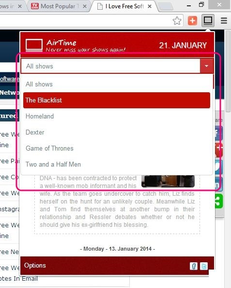 Air Time, is a very good Chrome Extension, using which you can get TV shows schedule, and see when the next episode of your favorite TV shows are going to get aired. This little Chrome Extension can also tell you about, when the next season of a TV shows is going to get premiered, later in the year. You can add as many television shows as you want in the shows list, regardless of channels, and view their next airing dates, together in one single platform, and read a small preview of the next airing episode. This chrome extension, also tells the airing episode number and the season. Plus, it also lets you view the dates and small preview of previous episodes, that got aired earlier, to the very first episode of the first season.