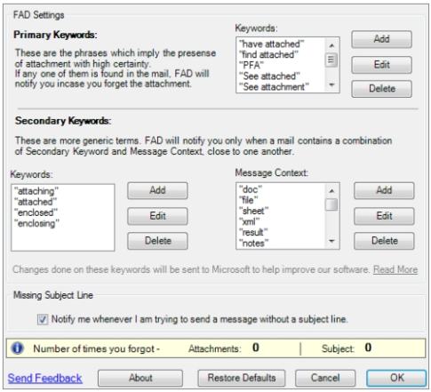 Forgotten Attachment Detector works based on a set of pre-defined keywords. It searches your message for those keywords. Here are some of the keywords it looks for in messages: “Have attached”, “find attached”, “PFA” etc. You can even add your own keywords to the list.