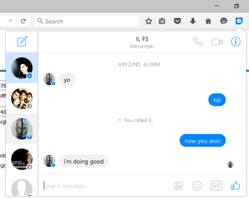 You can use the pop-up of this add-on to create a new message, access the list of recent chats, etc. Whatever you can do in Facebook Messenger on the web, you can do the same using its pop-up window. For example, you can send GIF, create an audio call, video call, etc.