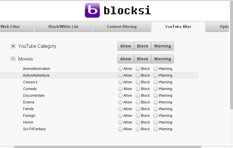 Blocksi for Chrome has the following features: web filter, black and white list, content filtering, YouTube filtering and options. Black and white list allows the user to allow or block selective sites. Content filtering enables the user to customise a list of expressions, words and patterns which will control web page access. YouTube filtering allows the user to categorise YouTube videos and filter them accordingly. It even enables the user to categorise and separate out movies. Options lets the user to create a Google apps account. It also allows the user to protect blocksi with a password.