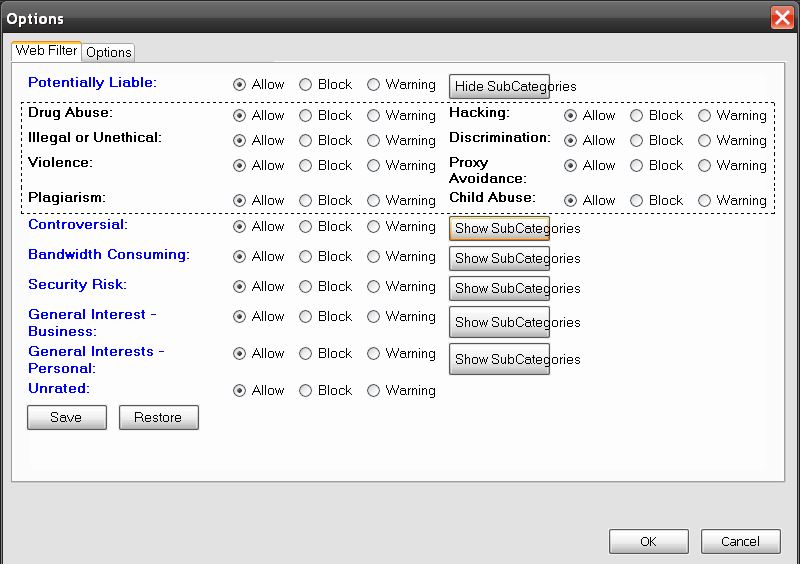 - Controversial:- Abortion, Tobacco, Alcohol, Alternative Beliefs, Weapons, Dating, Gambling, Extremist Groups,Homosexuality, Sport Hunting, Marijuana, Nudity and Risque, Adult Materials, Pornography, Sex Education, War Games, Advocacy Groups, Lingerie and Swimsuit