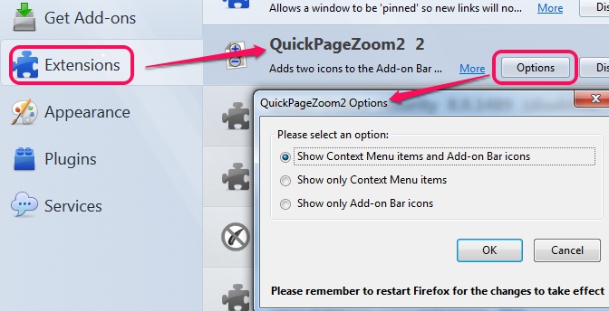 If you want to enable only context menu items or only add-on bar icons, then you can access Options of QuickPageZoom2. However, its good to keep both options enabled.