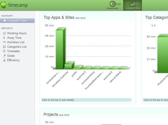 Two other buttons that are important are the three Timesheet View buttons and the main Timesheets/Computer Time all the way at the top of the interface. Computer View accesses the desktop client, which keeps track of computer activity, opened applications, time spent on tasks, etc. Key features of Timecamp – free online time management software are:
