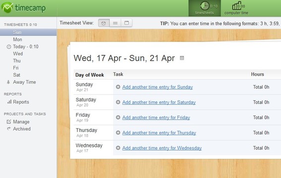 Timecamp is a free online time management software. It’s completely free for 1 user without any kind of restrictions. The usual combination of services are available, timesheets, tasks, both graphical and textual, projects and reports. What’s more interesting about time management with Timecamp is the fact that you get a desktop client for syncing tasks and keeping track of time spent on each one of them.