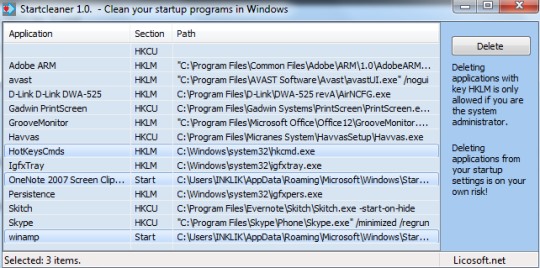 Startcleaner comes with a very simple interface and shows the list of all startup programs automatically. It scans Windows registry and startup folder to find out all startup programs and generates a list of those programs on its interface. From that list, you can select programs that you don’t want any longer to remain in startup list. But unlike, other startup program managers, Startcleaner doesn’t provide feature to add new programs to startup list.