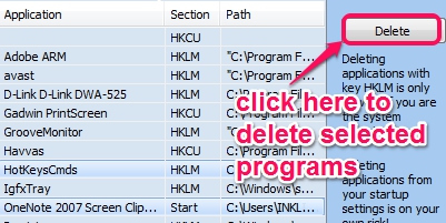 Immediately after opening its interface, list of all startup programs will be available automatically. All programs with HKLM, Start, and HKCU key will be available which you can select and delete accordingly. For removing HKLM key programs, make sure you are working on your PC with administrator account.