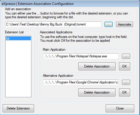 For the second method, you’re gonna have to open up the extension association configuration window. Right click on system tray icon >> Preferences >> Extension Configuration. Use the Add association field at the top to open up the file whose file type you’d like to associate. This can be any file, we added a .txt extension by selecting a random text file from desktop. Select the added extension from the list on the left, and then navigate to the portable app you’d like to be associated to it in the Main Application selection box on the right. Secondary is not necessary. Make sure to click OK before closing, and when you click OK, your temporary file association is active. From that point on, when eXpresso is running, alternative file association is active.
