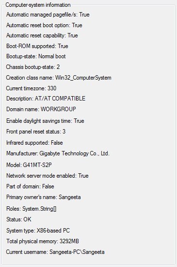 The “Computer-system information” section covers some key attributes of your system, like Bootup-state, creation class name, current time zone, description, domain name, manufacturer, model, owner’s name, status, system time, user name, and total physical memory.