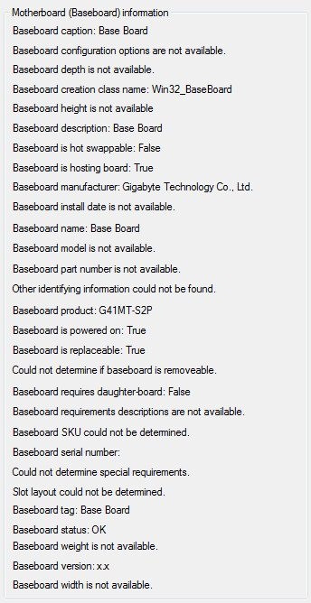 The “Motherboard information section” shows baseboard information, like baseboard caption, configuration, name, manufacturer, hosting board, model, product, tag, status, base, version, etc.