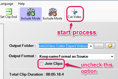 Note: Don’t forget to uncheck Join Clips option, as highlighted in above screenshot. Otherwise, all selected clips will be joined as a single video file. If you want to join multiple clips selected from input video, then only keep it enabled.
