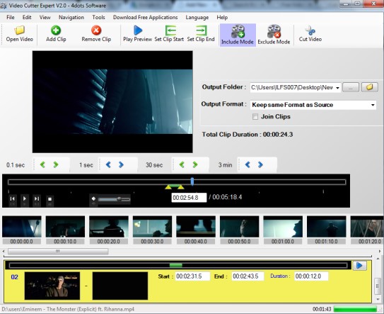 Video Cutter Expert (or Video Cutter Expert 4dots software) is used to create video clips from a single video file and also lets you exclude a particular part from input video. Thus, you can create multiple video clips together or can exclude unwanted part from a video (very useful to remove advertisement part from a TV show video). It provides a build-in video player that helps to preview output clips before starting the actual process.