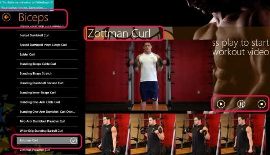 The UI of app is pretty simple and easy to use. The navigations work fine. As you can see in the above screenshot, there are exercise tutorials for almost each body part. Simply click on the requisite body part upon which you want to work on, and the screen will navigate specifically to that body part showing different exercise tutorials for that body part. Now, the thing that I liked at this point is that, if you don’t wish to read the textual instructions or go through the pictures, then you can always switch on video tutorial. The video tutorials are equally good and very well explained. You can pause, play, or stop it anytime. There’s no progress bar while you play video, so you can’t jump to a particular part of video. Simply play a video tutorial, pause it, get the stance (posture), and play it again, that’s it!