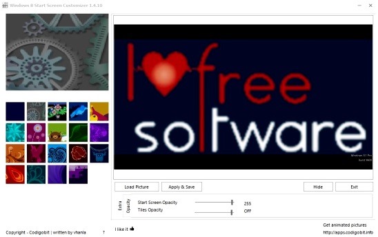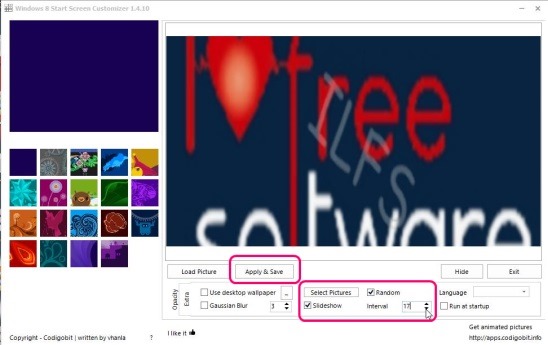 This little Windows 8 tutorial explains about playing a slide show of your favorite images in the Windows 8 and 8.1 Start Screen. There are lots of third-party desktop apps that let you set and play slideshow of images custom chosen by you. I am also going to one of the third-party desktop apps for the very purpose: Windows 8 Start Screen Customizer. You can download it by clicking on the link given at the end of this article. This desktop app, itself is very handy and has a lot of features using which you can customize Windows 8 Start Screen (which are not present by default in Windows 8 OS). It has a set of Start Screen themes, that you can choose from, change opacity of Start Screen and tiles, separately. Plus, it also lets you set a picture (stored locally), or a portion from that image, as the Start Screen background etc.