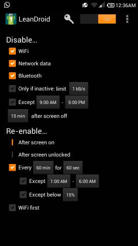 LeanDroid for Android is a free app which improves battery life of a device by turning off different connections when the screen is off. This free app has the ability to manage data, wifi, and Bluetooth; it saves the battery by turning off these connections when the screen is not active. To ensure that you don’t end up missing notifications, the app also allows you to set time intervals after which connections are restored for a short duration (like, for 1 minute after every 15 minutes). Some of the features in the LeanDroid for Android are paid, but even free features are pretty useful.