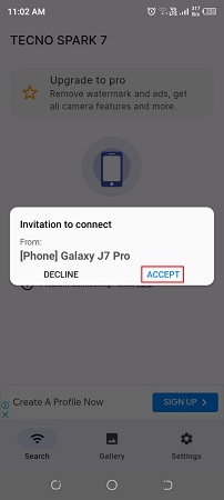 3. You will be able to see the Available Devices list in both the phones. Tap on your device name in the list and an invitation will be sent out to the other phone. Now, tap on ‘Accept’ in the Invitation popup. The two devices will now be connected to each other, and the Remote device is configured to control the Camera remotely.