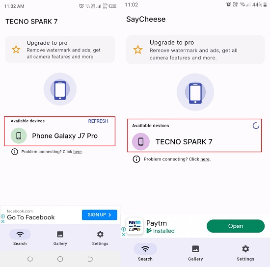 SayCheese – Remote Camera is a mobile application that allows you to capture photos and videos using two phones – one serves as the Camera and the other device works as the Remote. The app is available for Android and iOS and use the Nearby Devices feature to discover and connect the two phones.