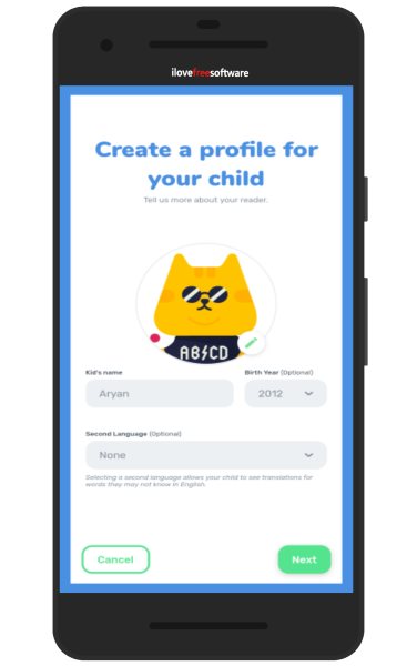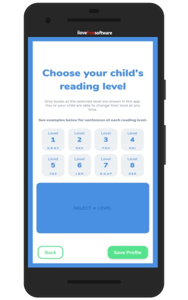 The next screen asks you to choose a reading level for your kid out of the 8 given levels. When you tap on a level, it will show the type of sentences that particular reading level has in the box given below. Once you have selected the reading level of your kid, tap the save profile button at the bottom.