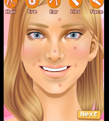 Using the controls that are available above the models head, you can start changing things, add earrings, blush, lipstick, eyeliner, etc. Don’t forget to use the concealer to hide those nasty looking blackheads.